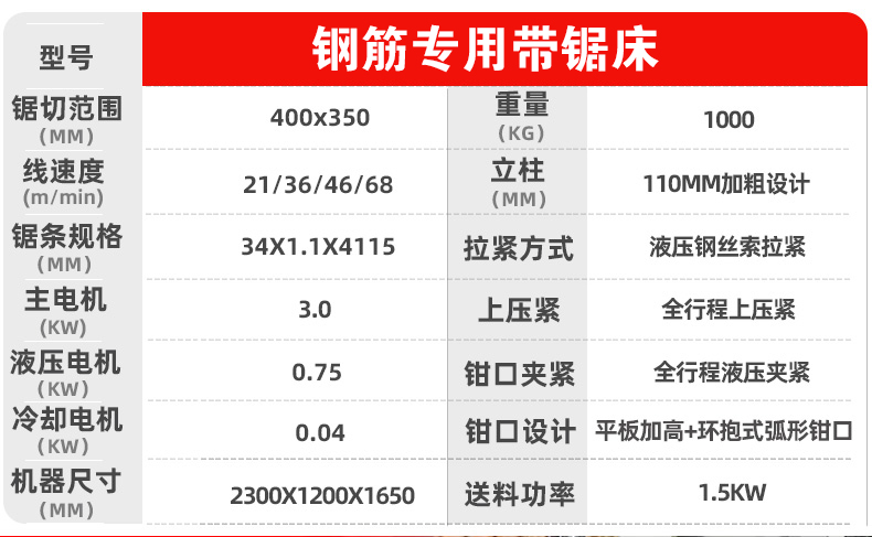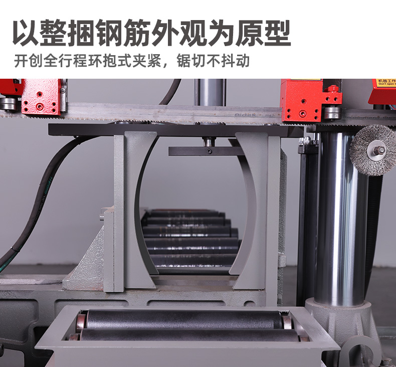 鋼筋專用帶鋸床是為了(le)工地建築和(hé)鋼材市場(chǎng)設計一的地款專用鋸床,該鋸床可成捆鋸切,鋼絲繩自動打捆,加上兩邊半圓型夾鉗(qián),再配上全行程下壓裝置,可一(yī)次性切割直徑300左(zuǒ)右的成捆鋼筋,該鋸床切割效率快,切(qiē)口平整,是一款您必不可少(shǎo)的切割神器。